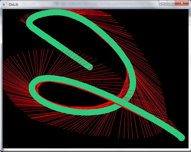 ClearDrawScreen() をコメントアウトしてみるとわかりますが、質点は単純にマウスポインタの位置に一直線に向かうのではなく、