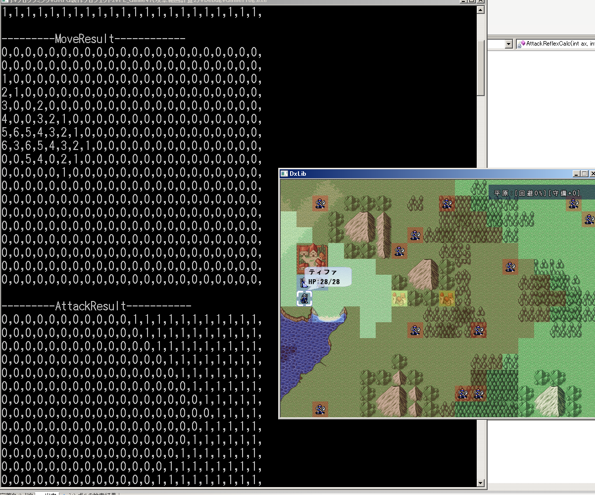 コマンドプロンプトには移動範囲を格納した構造体と攻撃範囲を格納した構造体を表示しております。