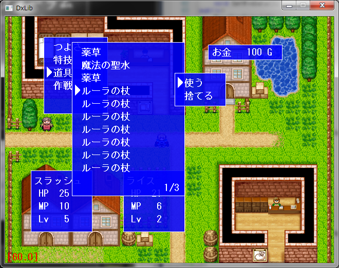 んで戦闘処理からちょっと離れてメニュー画面を作ってました