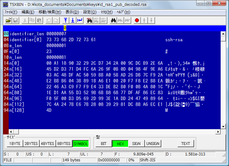とりあえずbase64をデコードしてバイナリエディタで開くと、公開鍵に書かれていたnのデータがあり、その下にeらしきデータも見えます。