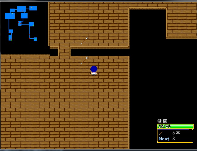 矢を外すと2ターン経過しているのか、敵が2歩動きます。しかも2歩目の動きが不自然です。 部屋の外に出ることができるバグがあります。見てわかるように、どうやらこの部屋には右側の壁がないのが原因のようです。 下の位置から矢を撃つと、壁に当たった矢は上の部屋へ移動します。大きな問題ではありませんが一応報告します。