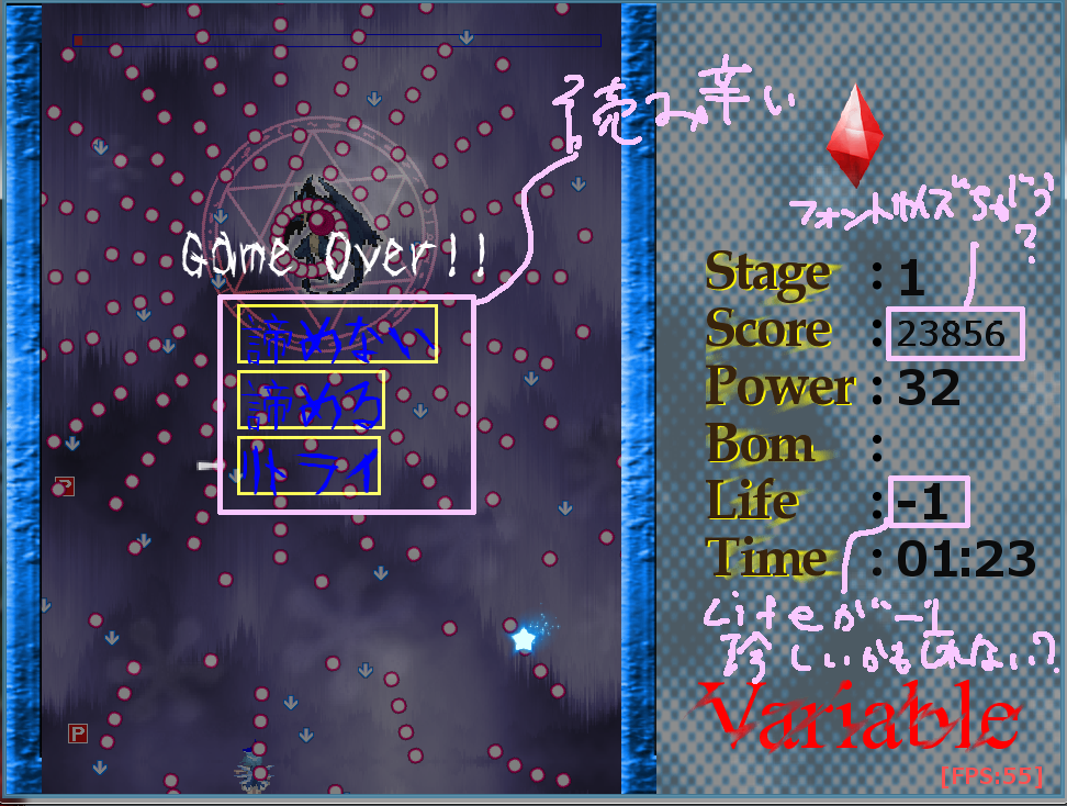 やり直すときに見えない敵が残ったり、フォントが消滅したり、