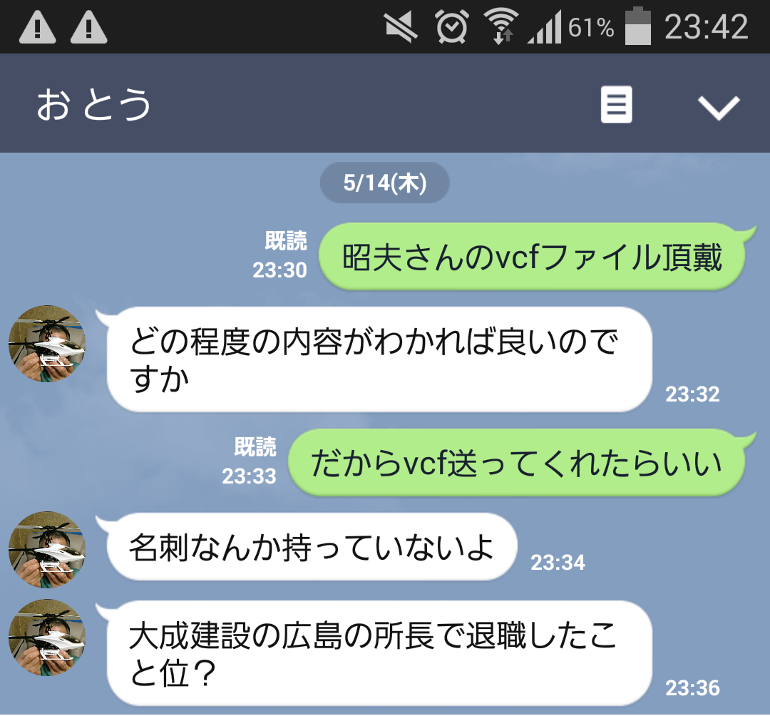「vcf送って」→おとん「所長でした」→私「は?」