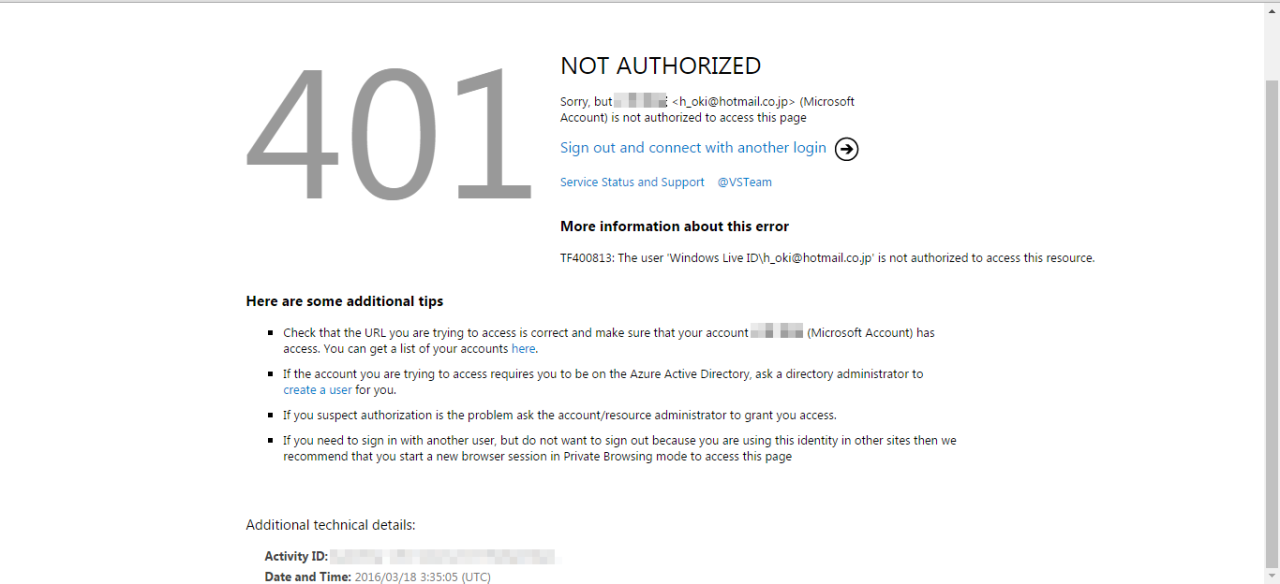 試しに古いWindows Live IDでサインインしてみたところ、401が出ました。