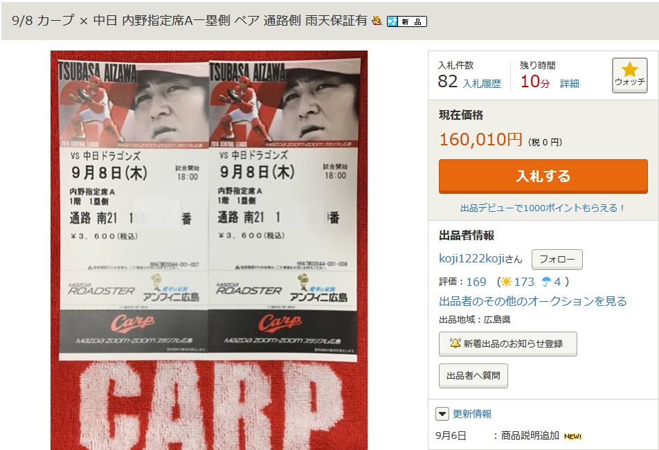 優勝が決まるかもしれない明日のカープのチケット3千円が16万円で入札されとる!