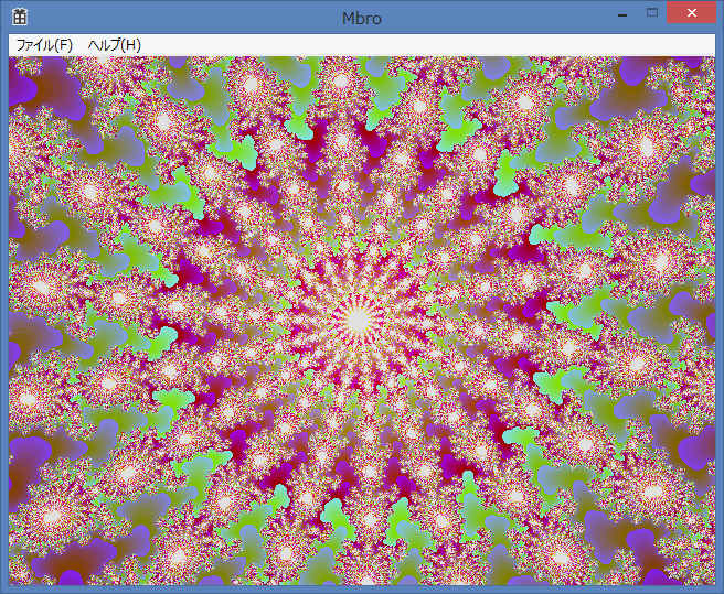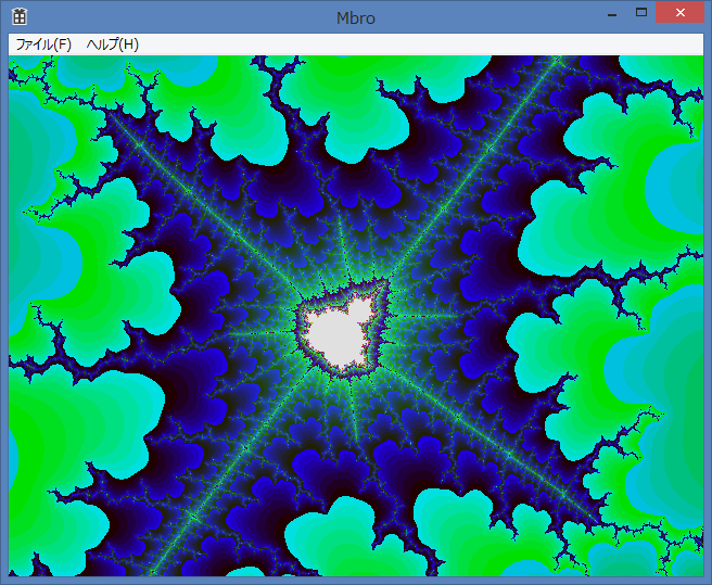 画像はクラスのテスト用に作ったマンデルブロ集合を描くプログラムです。久々に見ましたがほんとに不思議な画像ですねぇ。思わず見入ってプログラミングがストップしてしまいました^^;
