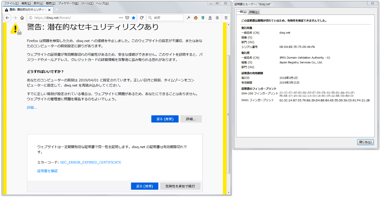 そして、ここのサイトの証明書の有効期限が切れましたね。