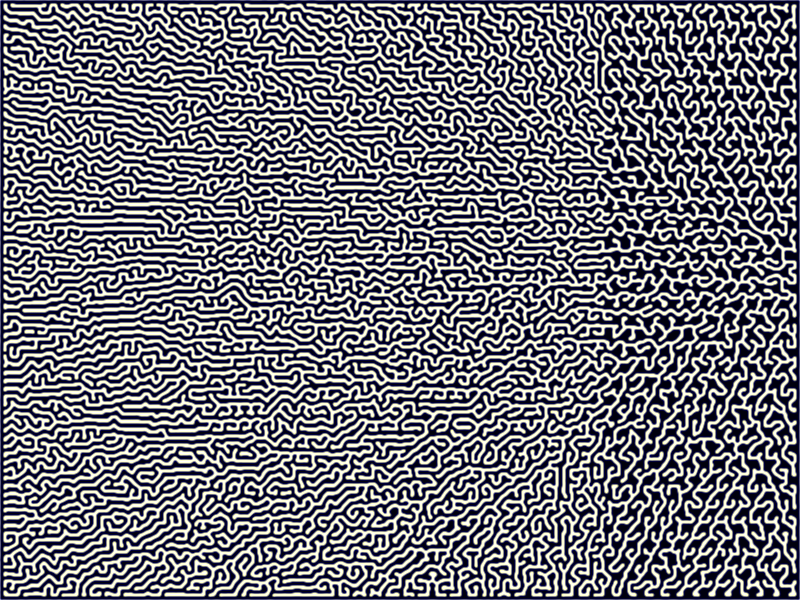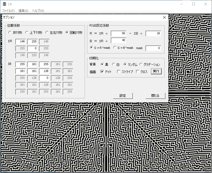 反応拡散系実験プログラムを改造して、反応が伝わる速さ(距離)の係数をいろいろ変えたら通路幅が変わらないかなと実験中。7×7とか計算範囲を広げれば差をつけやすいんだけど、そうすると計算にものすごく時間がかかってしまうだろうな( ̄д ̄)usao さんが書きました:4年前通路幅数倍で作った迷路の通路の幅を等倍相当に細らせるみたいな処理で(中間諧調用の)スカスカな迷路を作れないのかな?(通路を細くする=余白が多くなる) とか思いました.