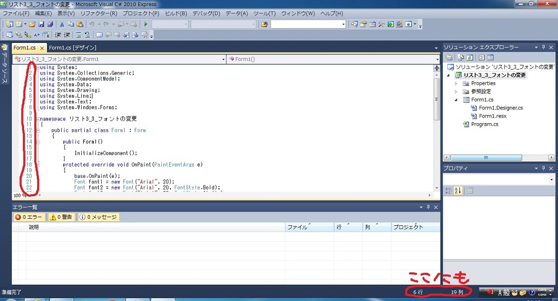そして、そのオプションを設定すると無事、Visual C# 2010 Express でも行番号が表示されるように