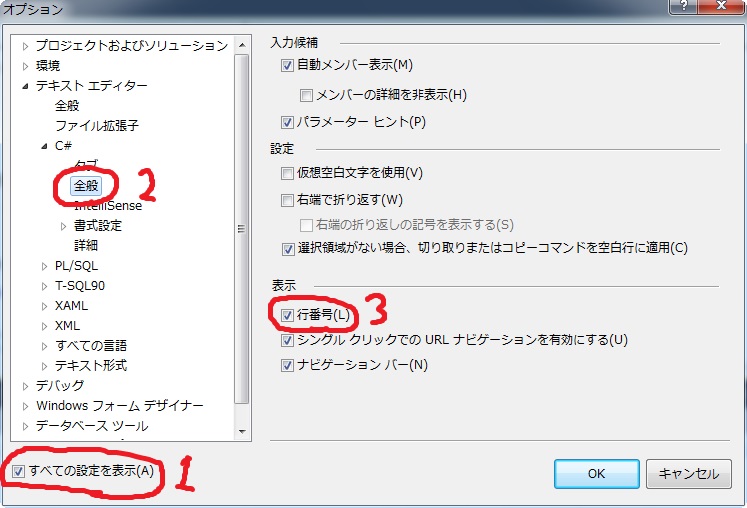 [ツール] - [オプション], [テキスト エディター] - [すべての言語] - [全般] - [行番号]