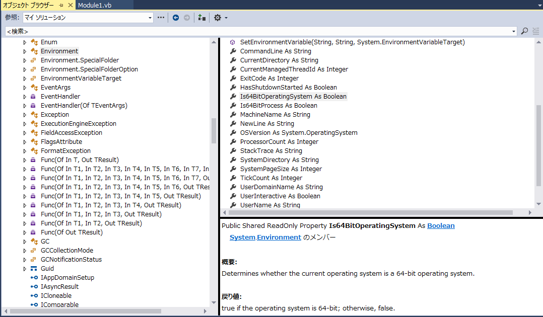 オブジェクトブラウザで確認してみましたが、Environmentの下にIs64BitOperatingSystemは入っていませんでした。