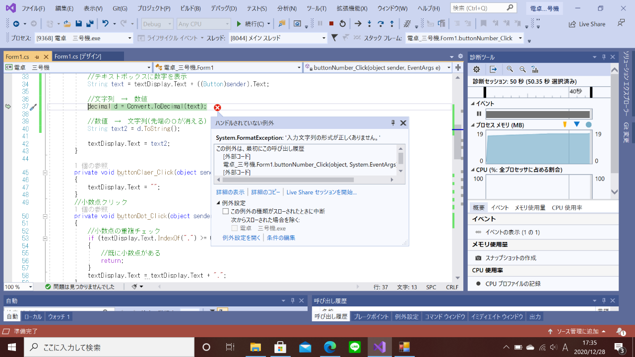 1つ目は、テキストボックスに初期値として表示している「0」に対して、実際に計算を行う際に打ち込んだ数字の前に0がついたままになってしまう問題です。そのためそれを処理しようとするコードにConvertを使うとデバックの際にエラーとなります。