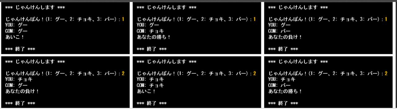 以下の仕様に従うコードとすること:1度の実行で,1度だけじゃんけんを行う.プログラムを実行する度に異なる結果が得られる(⇔見本コードと同様にtime関数をsrand関数に渡して乱数系列を変更する).完成後の実行ファイルを何度も実行すれば,次ページの全ての動作例を再現できる.次ページの動作例の表示内容を再現する.キーボードからの入力値が1, 2, 3以外の場合は反則である旨をメッセージ表示する.うまく勝敗が表示されません。手直しをお願いします