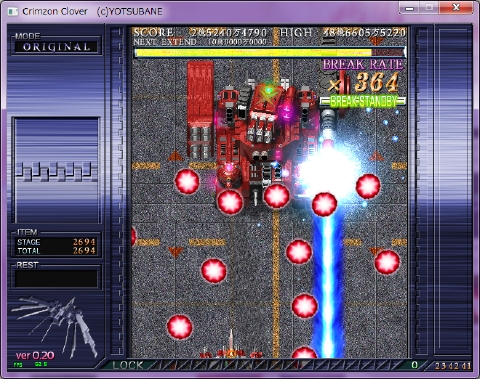 一方、画面右で自機が発しているレーザーは極細の光の周りにギラギラエフェクトを付けています。