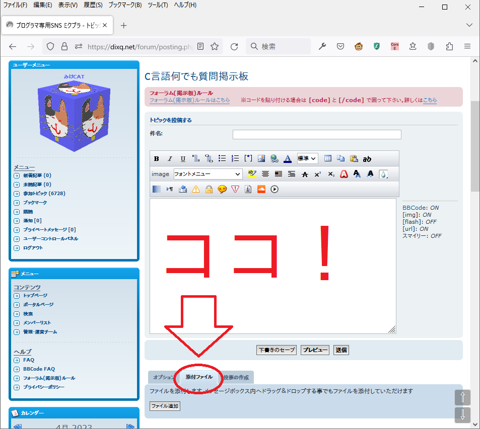ログインしているようなので、投稿画面 (クイック返信は除く) の本文を入力する欄に添付するファイルをドラッグ&ドロップすることで添付できるはずです。